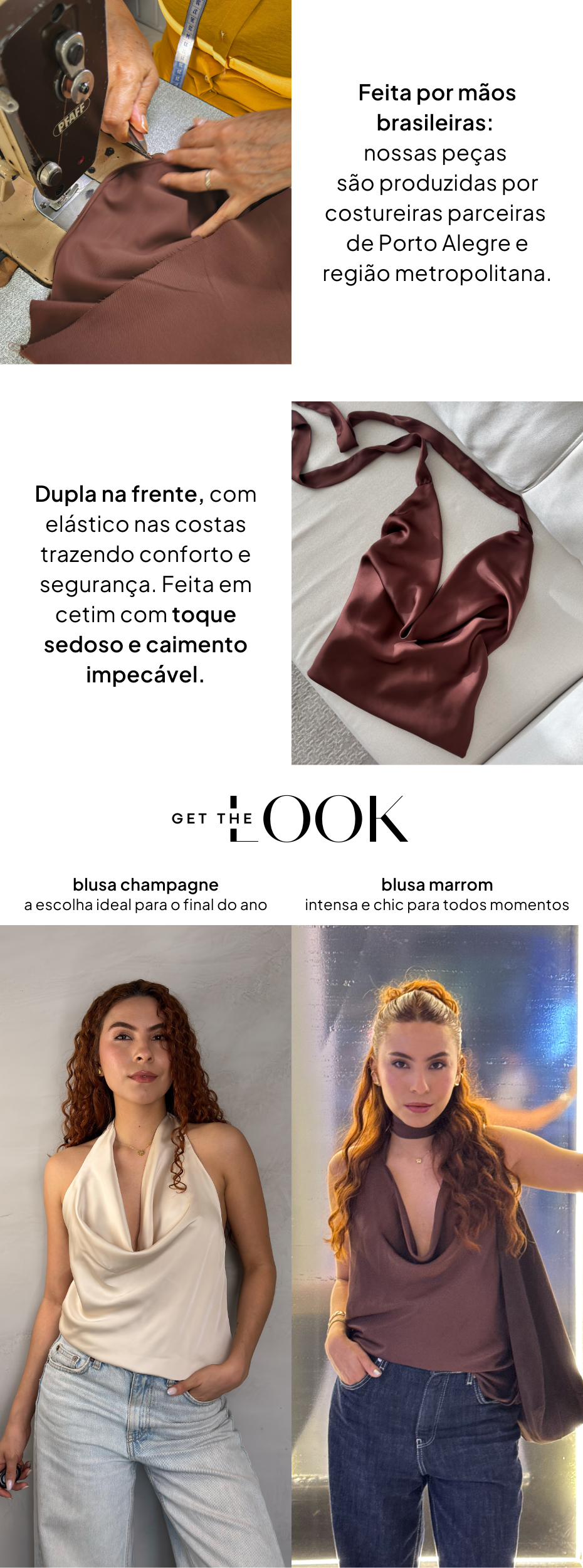 Modelagem frente única, dupla na frente, trazendo segurança para não ficar transparente, e caimento levemente solto no corpo. Costas à mostra com elástico de segurança no decote, e faixa para amarração atrás do pescoço, permitindo diferentes formas de amarrar e usar essa peça. É aquela peça que nos deixa femininas em 2 segundos, sabe? Mesclando com alfaiataria ela fica chic, elegante e arrumada, ou com jeans mais pesado no equilíbrio ideal entre o feminino, cool e casual.