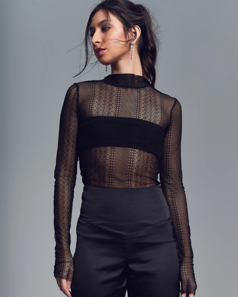 O desenho único e irreplicável da Renda Xanti. Blusa confeccionada em renda, modelagem justa ao corpo, com gola alta. Acompanha o top tomara que caia, feito em malha amni.